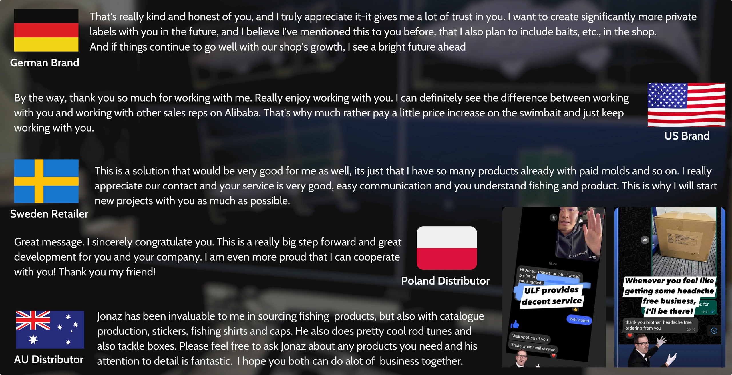 Save time and energy by working with us, we work like your partner not only just another vendor can't even understand how fishing really is.