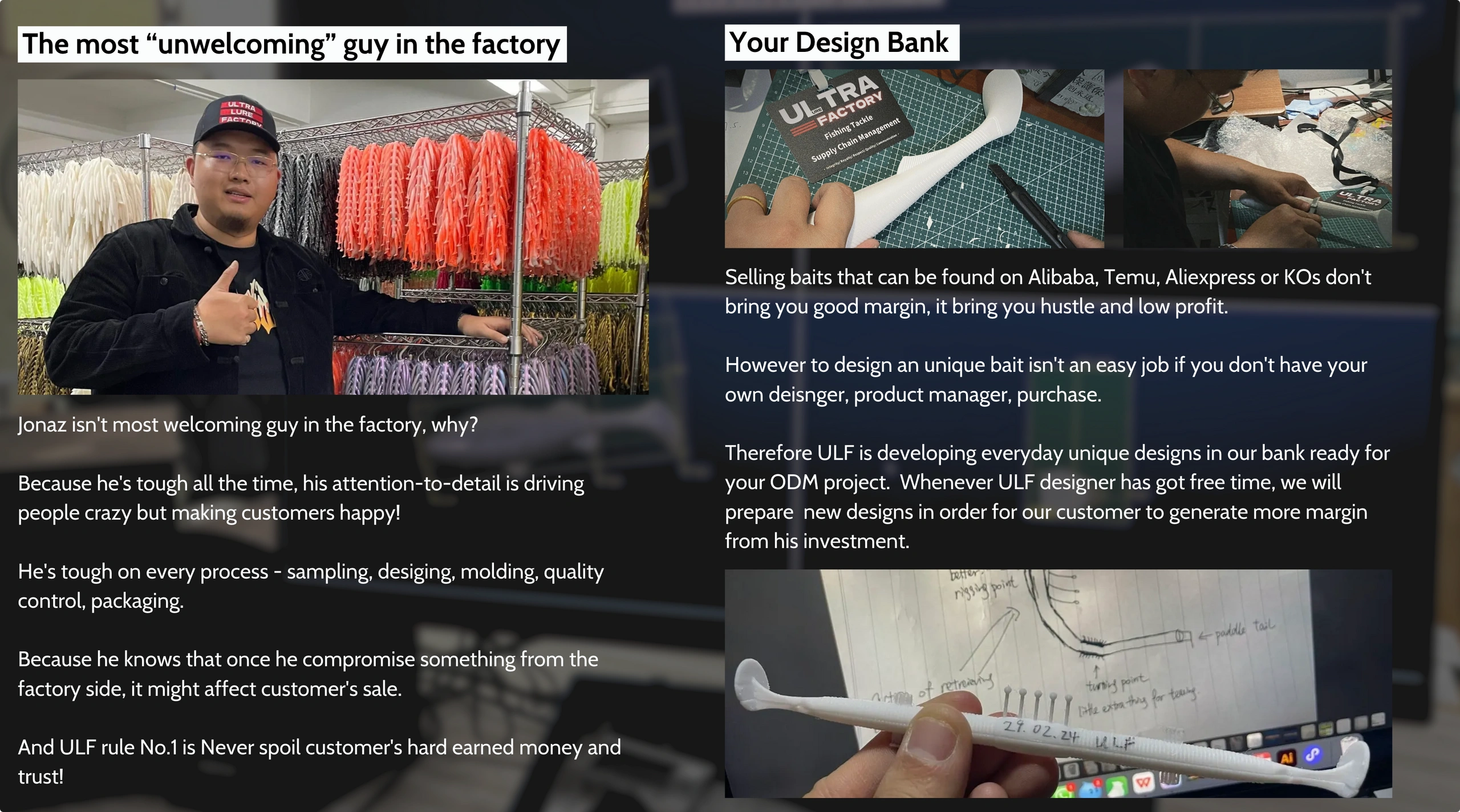Work once with ULF, there's no going back to rest soft baits factory. We care about quality more than anything, even our profit.